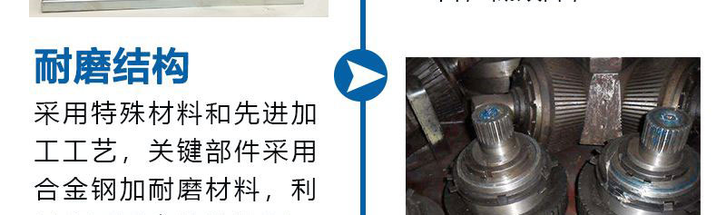 4、整機采(cǎi)用特殊(shū)材料和先進連軸傳動(dòng)裝置,關鍵部件采用合(hé)金鋼加耐磨材料,利用德國真空爐熱處理,使用壽(shòu)命延長5-7倍。