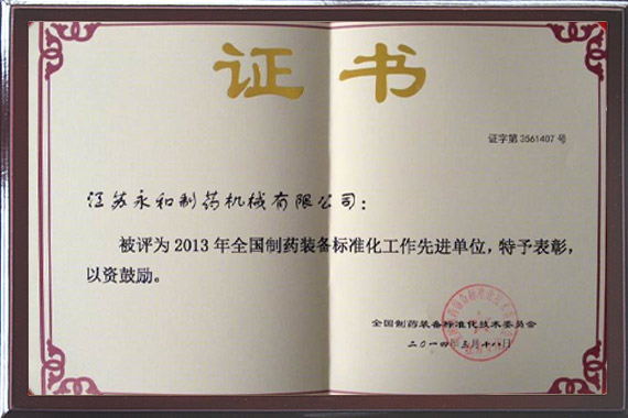 • 全國製藥裝備標準化工作先進單(dān)位證書