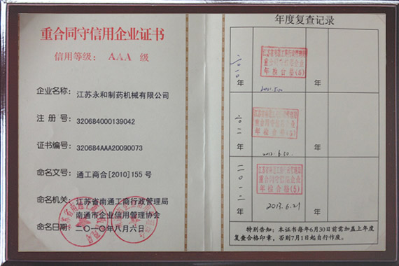 被海門市人民政府評為(wéi)“質量信得過(guò)企業”、“YONGHE”商標被南通市工商行政管理局評為知名商標(biāo)