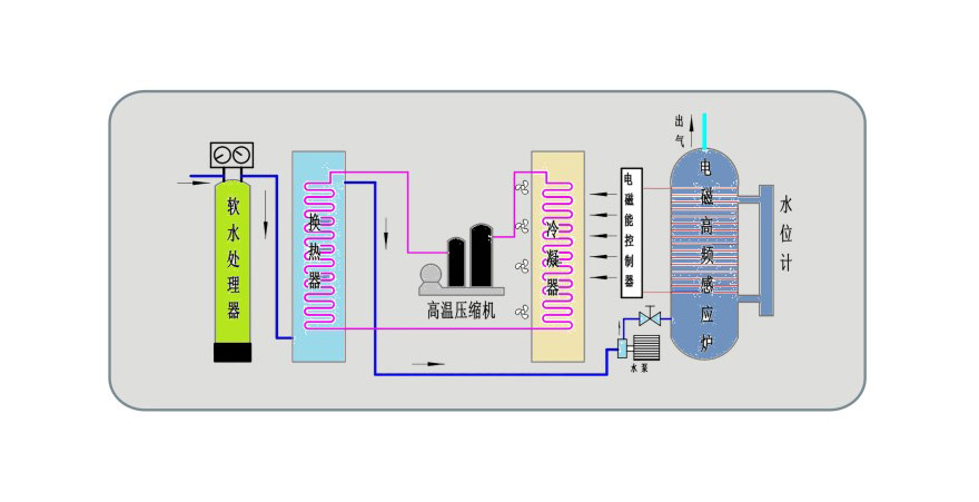 熱(rè)泵(bèng)製熱技(jì)術,隻消耗少量電能而(ér)獲取2~6倍於輸入功率的回報。它的耗能隻(zhī)是驅動壓縮機不斷蒸發吸熱(rè)冷凝放熱來製取高溫(wēn)熱能,而不是通過電(diàn)導熱源直接獲取熱能。因此,也有一定的局限(xiàn)性,現有技術尚不能利用熱(rè)泵製熱技術把(bǎ)水溫升高到沸點(100℃)以上,無法滿足用戶對高溫蒸汽的需求。電磁能製熱技術在該產品中的(de)應用,使產品製(zhì)熱能效得到了(le)互(hù)補。電磁能製熱技術除了高效節能具有升溫快、瞬間製熱的特點,把低(dī)能耗熱泵製熱器獲取的高溫水通過高壓水泵注入電磁能蒸汽發生器的鍋體內,2~3分鍾即可(kě)把水溫升高至150℃以上,壓力達0.4MPa的飽和蒸汽。