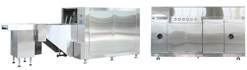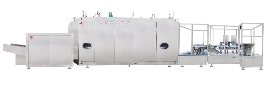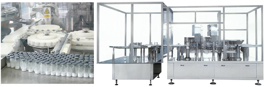 本機組符合“cGMP”要求,適用於西林瓶的洗瓶(píng)、烘(hōng)幹滅菌及粉劑(jì)分(fèn)裝,由CLQ-C型鏈式超聲波清(qīng)洗機、KSM型玻璃瓶隧道式滅菌幹燥機、FJZ-400型高速粉劑螺杆分裝機組成聯動生產線。