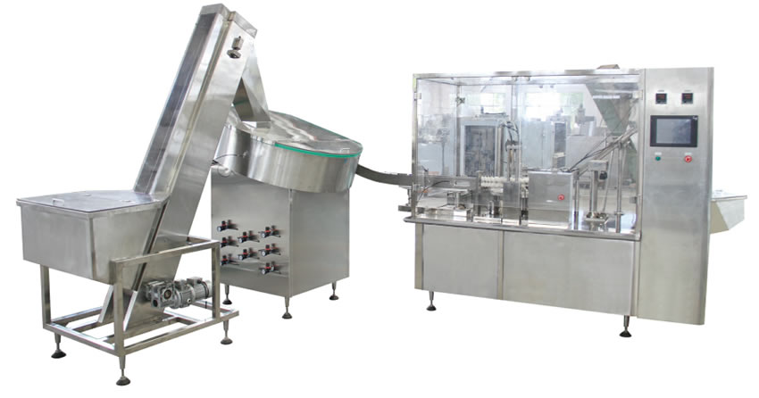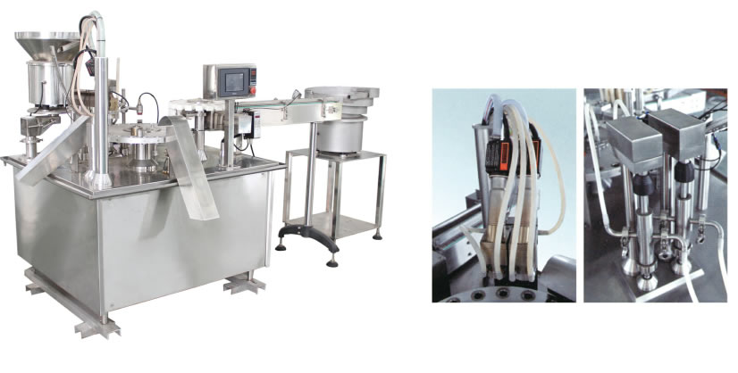 本機組(zǔ)符合“cGMP”要求,適用於(yú)新型易(yì)折塑料瓶的(de)灌裝與熱封口,是參照國(guó)外同類機型更新設計而成。 本機(jī)通過自動上瓶、底部灌裝、自動上蓋、熱熔式底部封口、機械手送出(chū)瓶等一係列特製(zhì)工序後完成灌封 工作(zuò),是國內口(kǒu)服液灌裝生(shēng)產的理想(xiǎng)設備。
